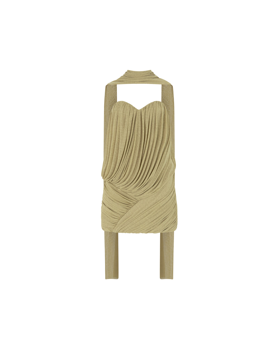(PRE-ORDER) Draped Mesh Ruched Shoulder-Wrap Dress