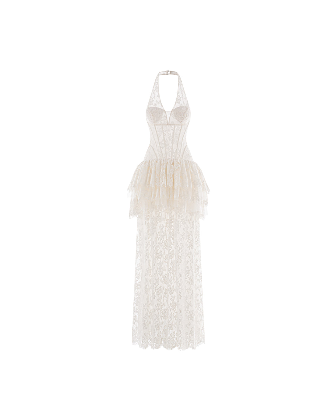 The Celestine Lace Peplum Gown is an artful blend of couture-inspired structure and romantic softness....