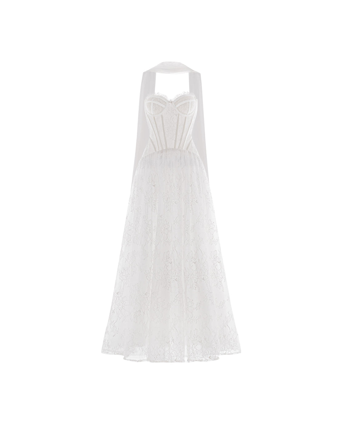 The Rosaline Lace Corset Gown with Tulle Scarf merges soft romance with a touch of...