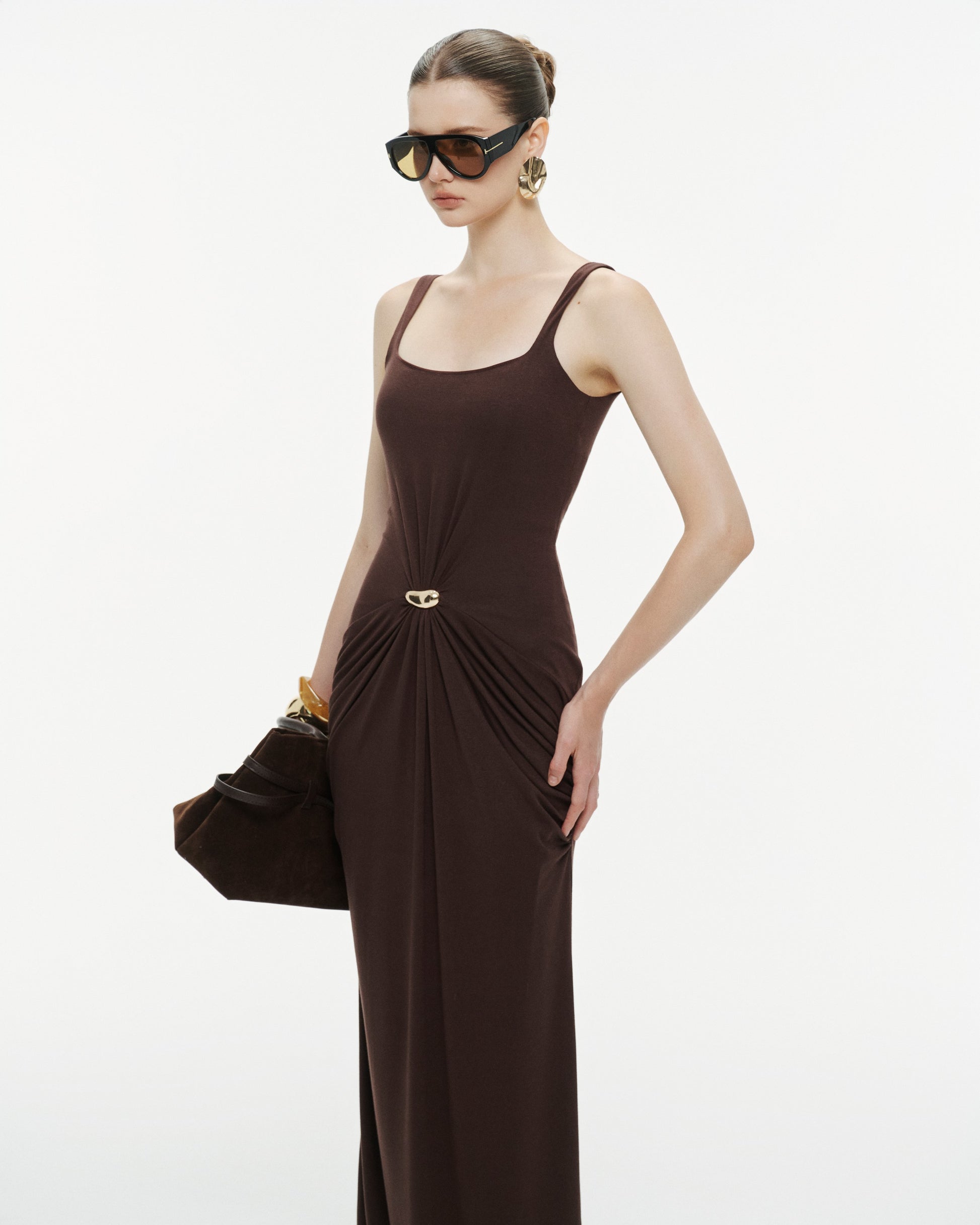 Brown Ruched Knit Dress With Gold Button