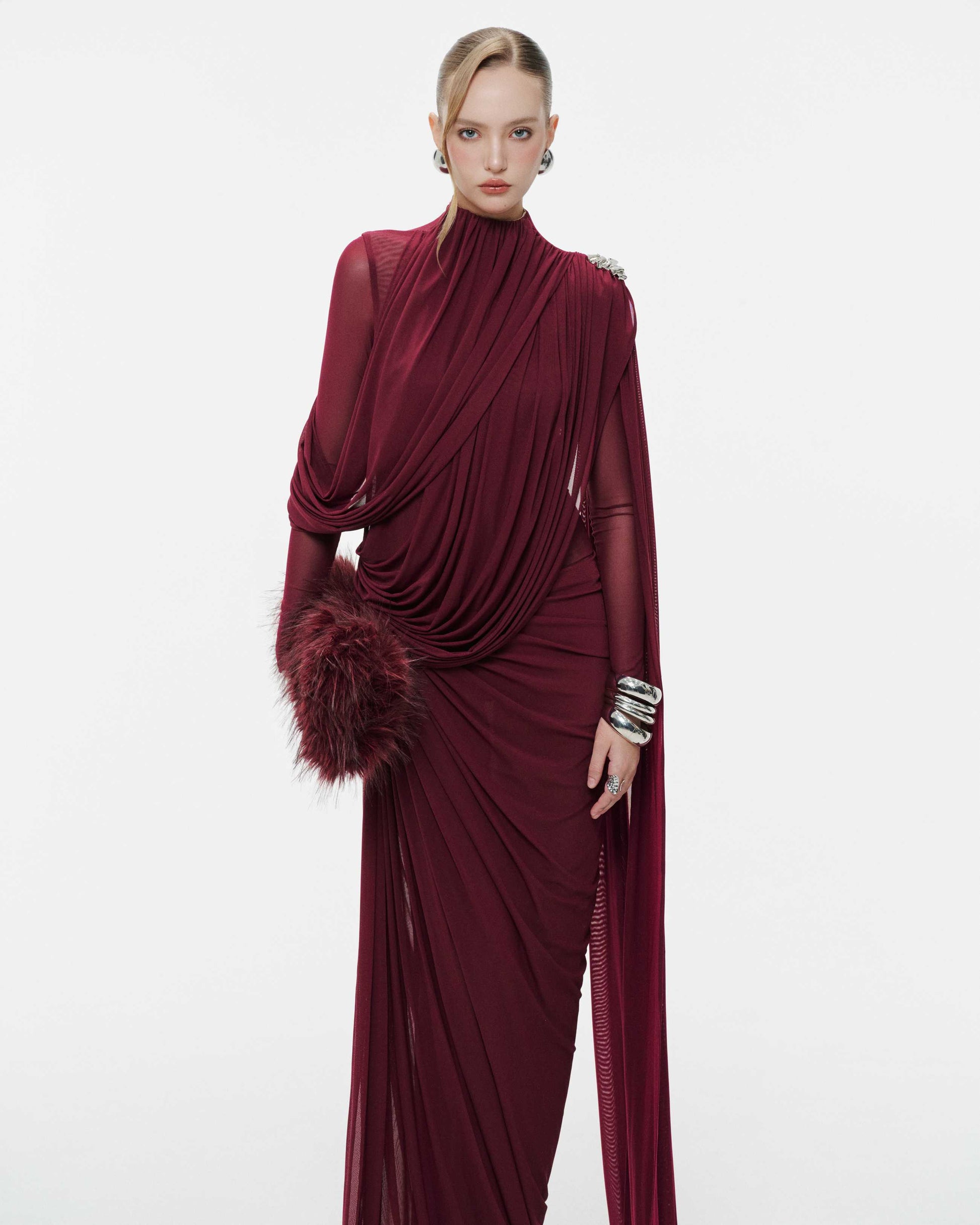 High-Neck Draped Pleated Dress With Asymmetric Ruched Long Drape