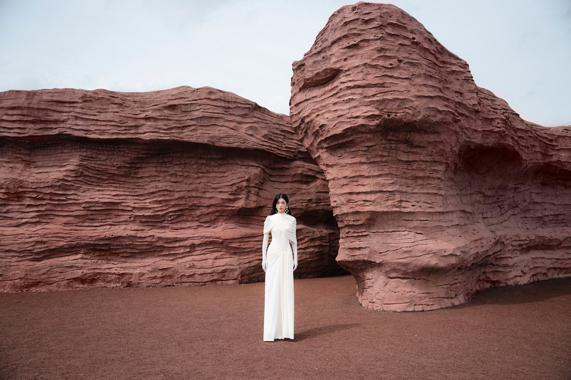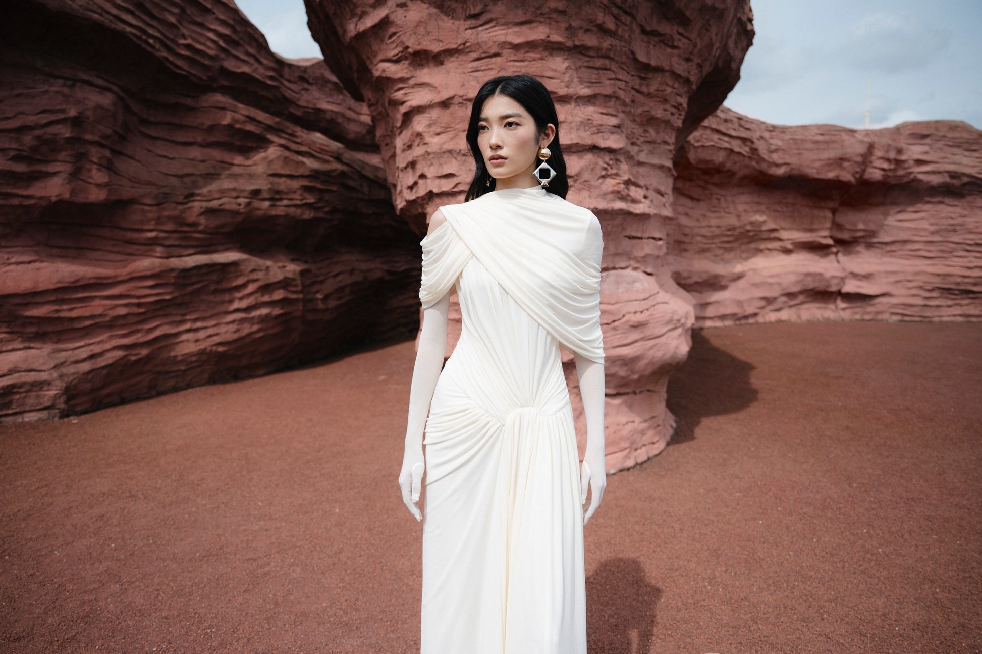 (PRE-ORDER)Draped Mesh Ruched Shoulder-Wrap Dress
